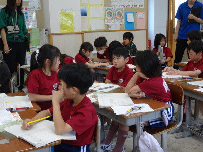 その後、1年生の家庭科や理科、英語科、社会科等の授業を参観させていただきました。子どもたちはどんな学習をしているのか真剣に見ていました。