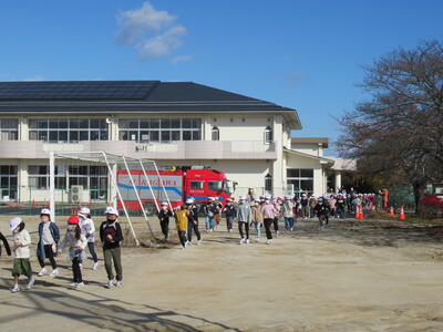 2021年11月5日 11時01分地震と火災を想定しての避難訓練を行いました。今日は、須賀川消防署から消防士に方に来ていただき、地震や火災から身を守るために大切なことや消火器の使い方を教えていただきました。6年生の代表児童が実際に水消火器を使って消火する体験も行いました。避難訓練の後には、最新鋭の消防車を3年生が見学させていただきました。