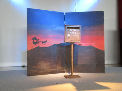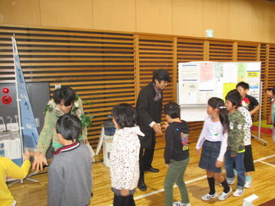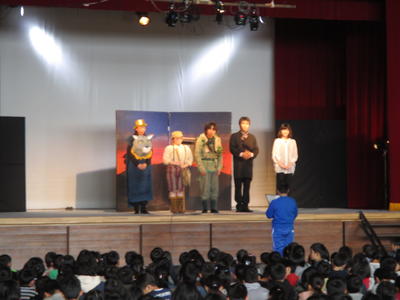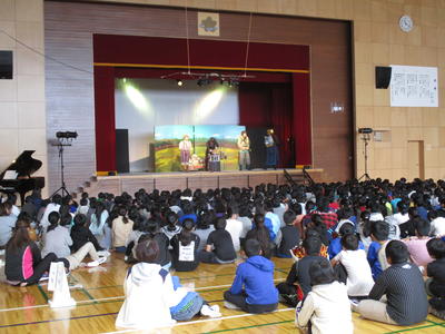 2019年10月21日 12時45分東京の劇団「スタジオ・ポラーノ」による童話劇「どんぐりと山猫」が、体育館で上演されました。宮沢賢治の童話が、飛びだす音楽劇となり、舞台上には大きな飛びだす絵本が登場しました。子どもたちは皆、その童話の世界に引き込まれていました。