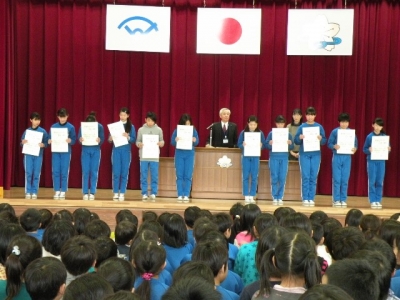 本日、「皆勤賞」と「栄光をたたえて」の表彰式を行いました。「皆勤賞」は6年間無欠席の児童3名に、「栄光をたたえて」は特設マーチング部の6年生児童11名に授与されました。どの児童も大きな声で返事を行い、胸を張って校長より賞状を受け取ることができました。