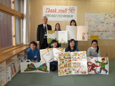 震災により、多くの図書を失った本校のためにと、CHICAGO FUTABAKAI様から、たくさんの新刊本をお贈りいただきました。図書室の空き棚に次から次へと新刊本が備えられました。子どもたちも大喜びです。