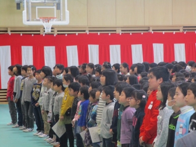 各学年の代表児童が修了証書を受け取り、最高学年になる5学年代表児童が今年度の反省と次年度の抱負を発表しました。春休み中、大きなけがや事故、トラブル等がないようにご家庭でもご指導の方よろしくお願いします。