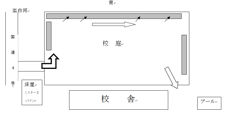 一方通行で奥からつめておとめください。白線内側のみ通行可能です。校庭中央へは乗り入れできません。また、校舎北側職員駐車場は来賓専用駐車場となります。