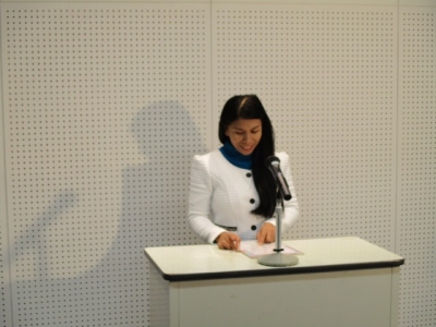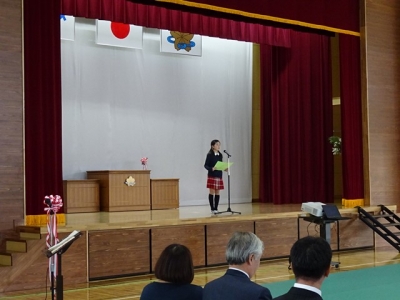 それから並木仮設校舎で学校生活を送ることになりました。体育館やプールがなく不便だと感じることもありましたが、地域の方々や全国の方々からの応援や励ましをいただきながら先生方や友達と共に楽しく思い出の詰まった4年間を過ごすことができました。今日来てくださっているNAOTOさんが、大黒摩季さんと一小の応援ソングとして作って下さった「希望の歌」は私たちにとって大切でそして大好きな曲となっています。多くの先輩たちも「希望の歌」を歌い胸を張って卒業していきました。
