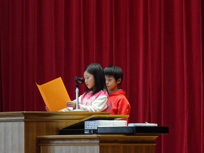 本日、3校時目に第2学期の終業式を行いました。校長から2学期から大黒町新校舎での生活が送れるようになったのは、たくさんの方々のおかげであること。感謝の気持ちを持って生活してほしいことを話しました。その後、2年生と4年生の代表児童から、2学期の反省と冬休みにがんばりたいことの発表がありました。