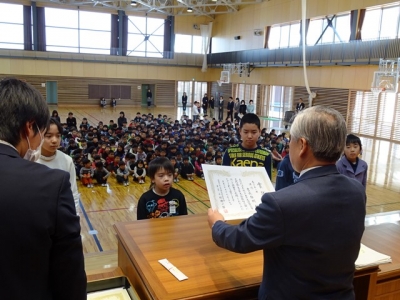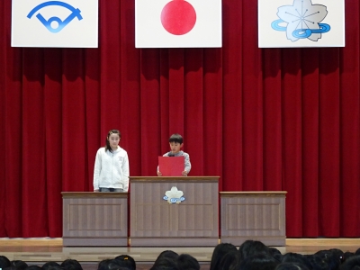 新たな年になり、生き生きとした表情で迎えた始業式では、元気よくあいさつを行い、元気よく校歌を歌いました。また、児童代表2名が3学期に向けての抱負を言いました。3学期では、次のステージへと進める準備をして、充実した学校生活を送れるようにしていきたいと思います。各ご家庭でも次のステージへと進めるよう、3学期からご指導をよろしくお願いします。