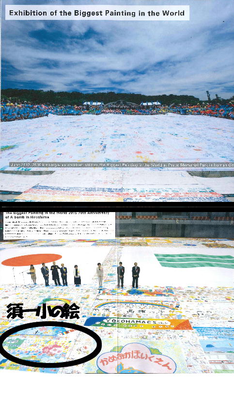 8月に広島市で行われた被ばく70周年の会の中で展示されました。日本の61市区町と世界の26ヶ国の絵をつなげ、45m×70mの世界一大きな絵に仕上がったそうです。