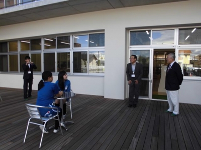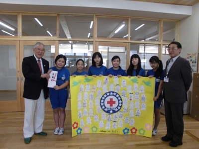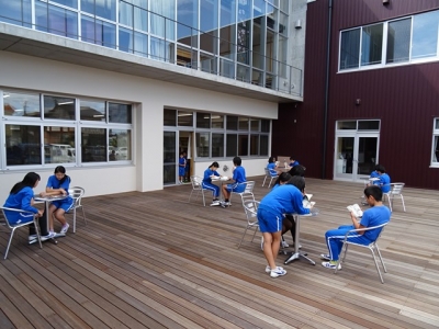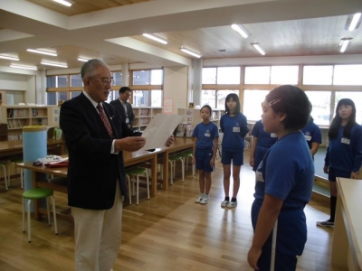 9月29日に日本赤十字社新潟支部から2名のお客様が来校され、本校に読書テラスで使うテーブルとイスをセットで10組寄付してくださいました。贈呈式では、ボランティア委員会児童が代表で出席し、感謝の言葉を述べることができました。早速、子どもたちはいただいたテーブルとイスを使って、テラスで読書を楽しんでいました。