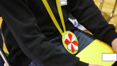 「みなさんの同窓会入会を祝って、第一小学校の「校章」【桜水】の文鎮が贈呈されました。校章の裏側には「2024」と刻まれていて今年卒業するみなさんにだけ送られるものです。お父さんやお母さんが第一小学校を卒業して同窓会のいわゆる同じ会員で、同じ文鎮を持っているかもしれませんが、刻印が違っていて、みなさんが手にしている文鎮は、皆さん80名だけのオリジナルですので大切にしてほしいと思います。