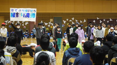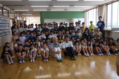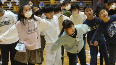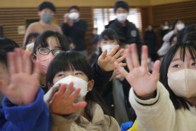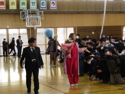 子どもたちの待つ体育館。子どもたちが拍手で大黒さんとNAOTOさんを迎えます。