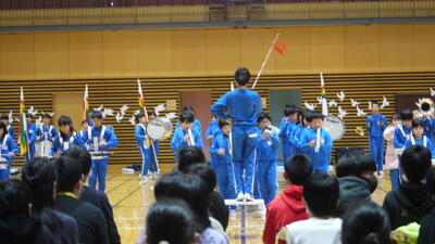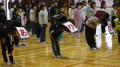 5年生は「鼓笛」の披露。披露に先立って、移杖式が行われました。6年生から5年生へ鼓笛隊がh機継がれます。移杖された指揮棒を手に主式の児童が「伝統を受け継ぎ、がんばります」とあいさつ。これから第一小学校の鼓笛隊は5年生が一年間しっかり演奏してくれます。「がんばれ5年生!」そんな思いを持って6年生は5年生の演奏をきいていたはずです。