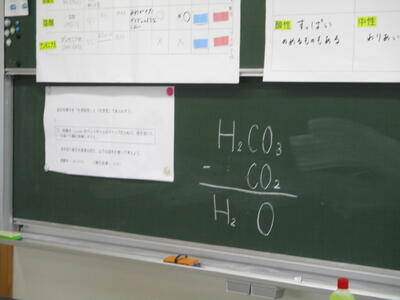 この単元は、そもそも提示した「謎の水溶液A~Eが何か突き止めていこう」ということからはじまった学習です。突き止める過程の中で、子どもは、「水溶液には気体が溶けているものもあること」「水溶液には金属を溶かす性質を持つものもあること」「水溶液は酸性、中性、アルカリ性に分けられること」をとらえ、理解してきました。また、実際に煙と水をあわせて酸性の水溶液をつくり、それが酸性雨が降るメカニズムであることもとらえてきました。