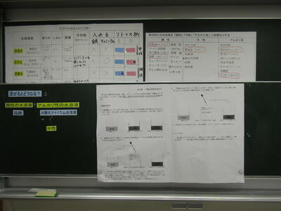 本時は、12時間扱いの最終。「酸性とアルカリ性の水溶液を混ぜるとどうなるか実験を通して知る」つまり、「中和」について理解することがねらいです。