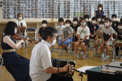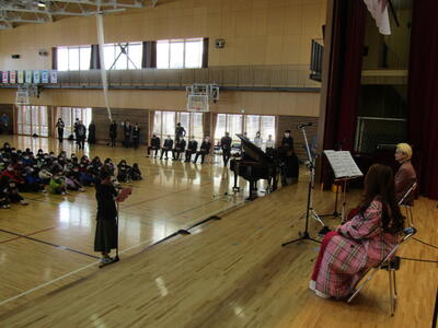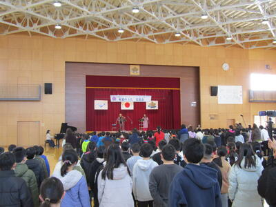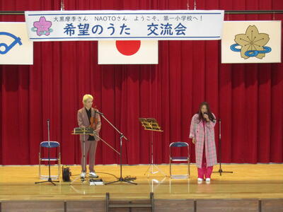 二人は一小にとって大事な歌、「希望のうた カワセミのように~」の作曲をNAOTOさんが、作詞を大黒さんがしてしていて、折にふれ学校を訪れ、子どもと交流の機会を持ってくれています。