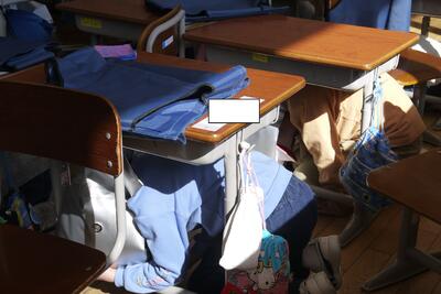 「地震がおさまりました。児童の皆さんは先生の指示で避難の準備をしてください。」