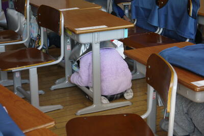「ただいま、大きな地震がありました。児童の皆さんは、机の下など安全な場所に身を隠してください。」と放送。