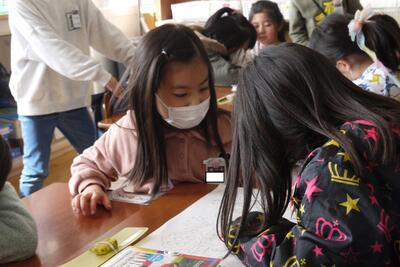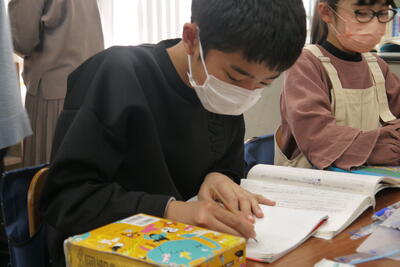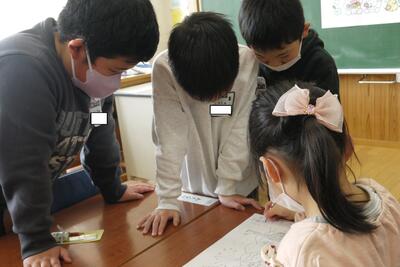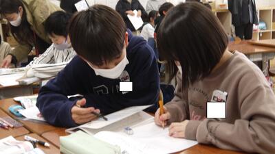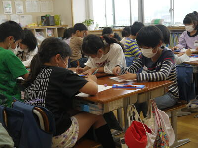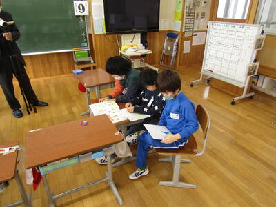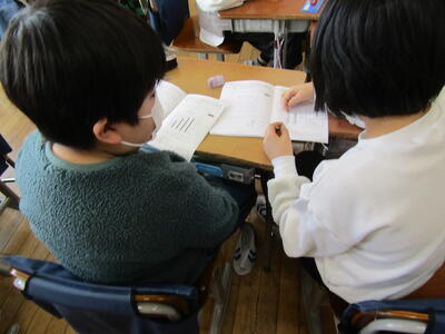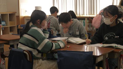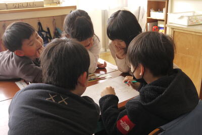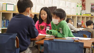 日頃の学習どおり、グループやペア学習で学び合いながら、難しい問題に挑戦させた学級もあります。