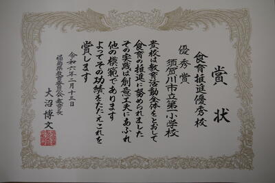 2024年2月14日 17時29分第一小学校は「食育推進優秀校 優秀賞」を受賞しました。昨日、2月13日(火)福島市で挙行されたふくしまっ子体力・健康優秀校表彰式に養護教諭が出席、賞状を授与されました。。
