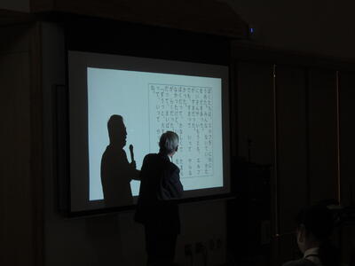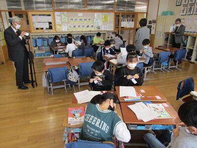 この日、愛知県より東海国語教育を学ぶ会 石井順治さんが来校。一日本校の教育活動を参観し、今後の授業づくりに向けたアドバイスがありました。