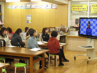 1年生から3年生までの教職員は、みんなで図書室で放送を聞きます。