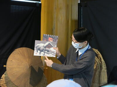 学芸員の先生が絵を使って説明してくれたもの・・・・これは笠(かさ)と蓑(みの)。今でいうと雨や雪よけの傘と雨合羽のようなものでしょうか。。。。