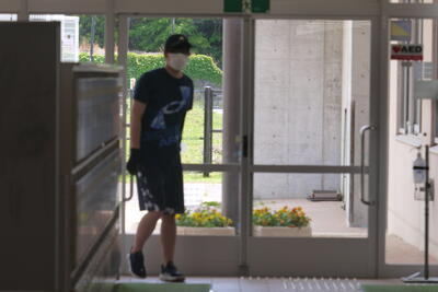 職員玄関から入ってくる、物言わぬあやしい不審なサングラス男。