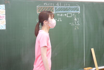 みんなで考え合いながら、「答えが正しいかどうかは、答え(26)とひく数(15)をたしてひかれる数(41)になるかどうかをみてみればよい」という話になります。