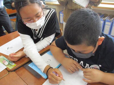 悩んだときには、隣の友達に「ねぇ、教えて。」「ここ、どうやればいいの?」と聞くこと。聞かれたら「うん、いいよ。」と一緒に考えてあげること。