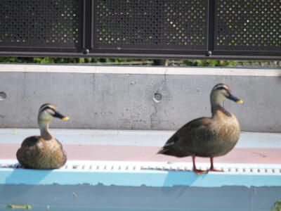 プールサイドの温度計は32℃。絶好の条件に、マガモがもうまてぬとばかりに、プールサイドをグワグワ声を出してあるいています。ここ数年、毎年恒例、釈迦堂川方面からやって来ていると思われるマガモのつがいです。