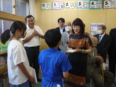 2023年6月8日 09時00分今年も、高橋麗秋さん(北海道在住 エッセイスト・歌手)が市ロータリークラブの皆さんと来校。子どもたちのためにと図書券を寄付くださり、代表で図書委員の児童がうけとりました。