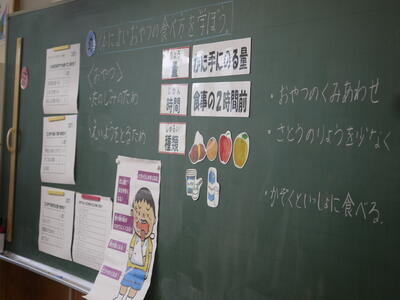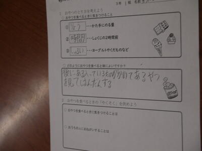 どの学級とも授業の最後には、「家族に協力してもらって一定期間、どんなおやつをどのぐらい食べたか、おやつの記録をとって、また振り返ってみよう」ということになりました。
