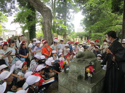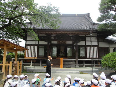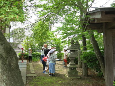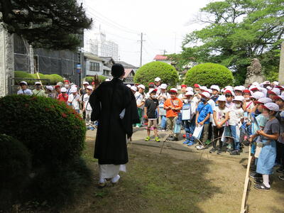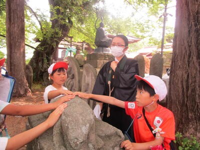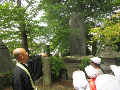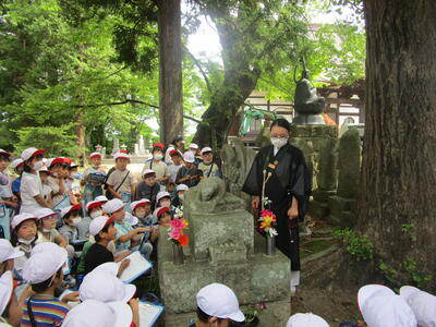 松尾芭蕉が参拝したことでも知られる歴史のあるお寺です。大きなイチイの木も有名なのですが、子どもたちが夢中になったのは、住職さんが話してくれた「シロ」の話。その昔、住職さんに代わって伊勢神宮まで行ったと言われているとても賢い犬がいたそうで、今は石像になってまつられています。