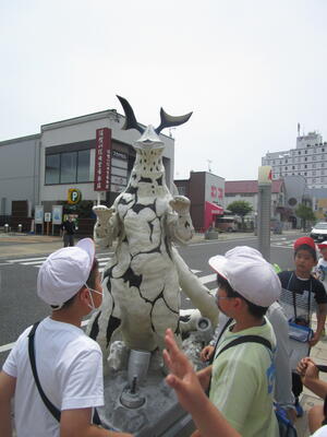 須賀川の中心商店街が並びます。近年は、ウルトラマンにちなんだ像が建てられ、ちょっとした観光スポットにもなっています。皆さんはこれらの怪獣の名前、わかりますか?シュワッチ!