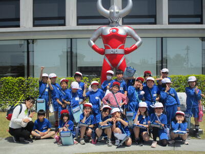 楽しかった市役所見学。ウルトラの父の前で記念写真をとりました。シュワッチ!!