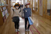 お兄さん、お姉さんにあたる2年生は、1年生の案内役。仲よく手をつないで学校内を案内します。