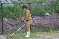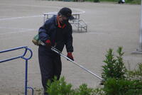 今日は、PTAの皆様にご協力いただいて奉仕作業。このあと集合する多くの皆様の作業に先立って、電動草刈り機に