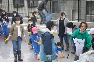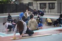 草刈り作業が終わるころ、細かいところの除草、窓磨き、プール清掃のために多くの保護者の皆様が来校してくださいました。