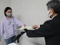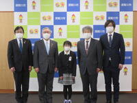 上記のコンクールで女性部会連絡協議会会長賞を受賞した6年の味戸さんが、市長や教育長の前で、