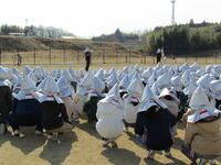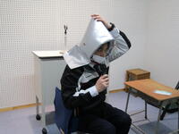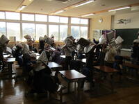 次に、ご寄付いただいた防災頭巾を使用して、避難訓練を行いました。どの児童も真剣に取り組んでいました。