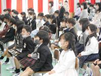 そして、6年生は「校歌」を鼓笛演奏で発表しました。1年生の子ども達からは、「すごーい。」