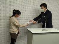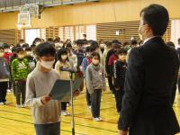 交通安全委嘱状交付式では、須賀川警察署の石田様から6年代表の中澤君へ、家庭の交通安全推進員
