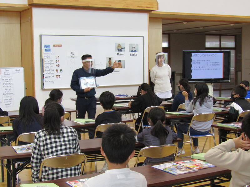 2020年5月20日 10時05分今日は、今年度初めて5・6年生の外国語科がありました。5・6年生は、今年度から年間70時間実施となり、およそ1週間で2時間程度学習します。今年度担当していただくのは、外国語専科の佐藤亜里沙先生とALTのベンジャマー・ラワガン先生です。