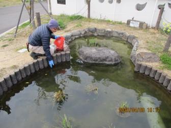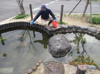 ・・・春季休業中の4月上旬、鈴木巧様と大寺正晃様で池の水を全て抜き、きれいに掃除をしていただきました。それだけでなく、餌をまいたり、ひびが入ったりしたところの補修をしていただいたりと、1年を通じてお世話になっております。お陰様で、そこに住んでいる魚たちも植物たちも、一層元気になったように思います。