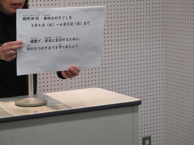 ・卒業式は当初の予定通り、23日(月)に卒業生、在校生代表の5年生、保護者、職員のみで行います。内容を変え実施時間を短縮します。