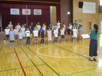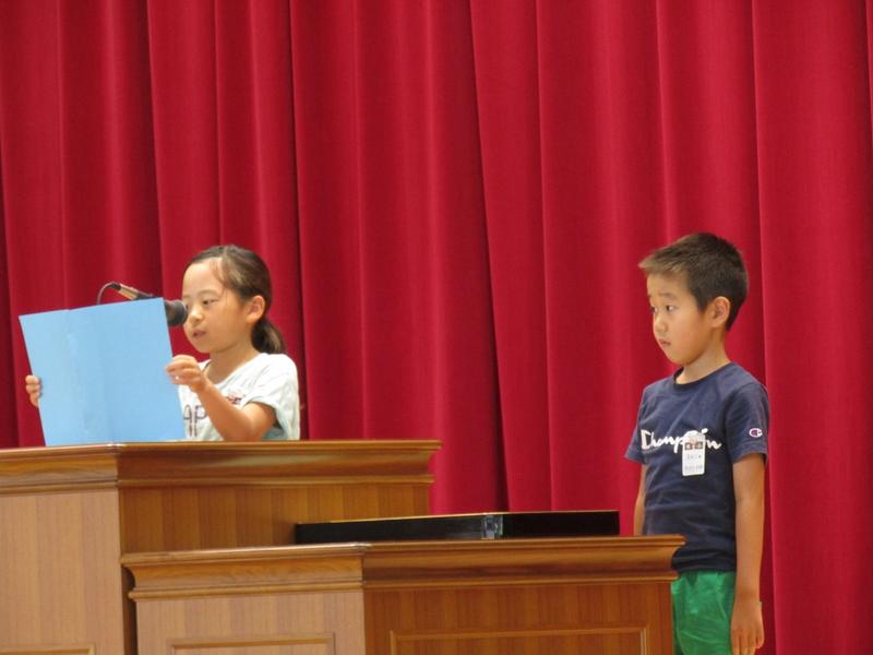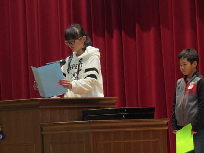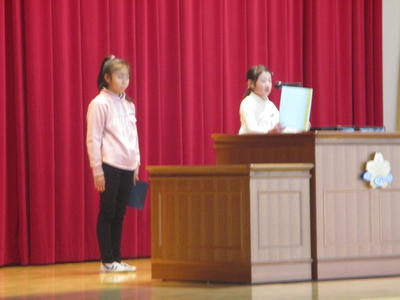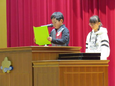 また、1年生と4年生の代表2人から、2学期の反省と冬休みの目標についての作文発表がありました。最後は全員で校歌を歌い、式を終えました。