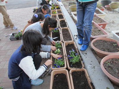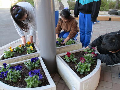 2019年11月26日 17時20分夏から秋にかけて咲き誇った花々が終わりを迎え、校舎前の花壇やプランターの花も植え替えの時期となりました。環境委員会の皆さんの力により、パンジーやビオラなどの花の苗が植えられ、花壇をきれいに彩っています。