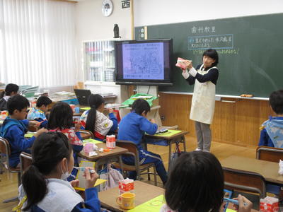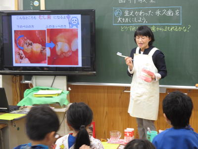 歯科衛生士の中山先生を講師にお迎えして、3年生の歯科指導が行われました。乳歯から永久歯へと生えかわり始めているこの時期に、しっかりと歯磨きをして歯を大事にしていこうという内容の学習でした。
