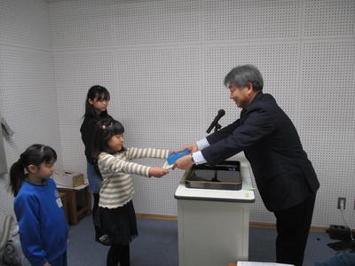 2019年12月11日 17時45分昼のテレビ放送時に、賞状の伝達を行いました。各種コンクール等で優秀な成績を収めた児童の皆さん、おめでとうございました。校長先生から、とても上手に賞状をいただくことができました。