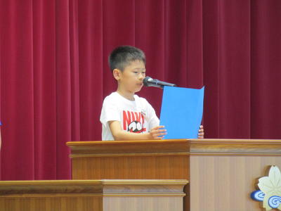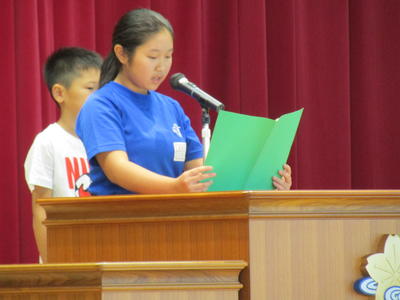 始業式では校長先生から、「桜水(おうすい)」の言葉にかけて、「お」もいやりの心で、「う」つくしい心で、「す」なおな心で、「い」っしょうけんめいな心で、この2学期を生活していきましょうというお話しがありました。引き続き、4年生と6年生の代表児童による「夏休みの反省と2学期のめあて」についての発表がありました。最後は、全校児童と教職員で校歌を歌い、式を終わりました。