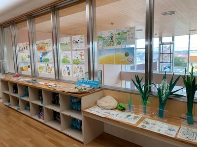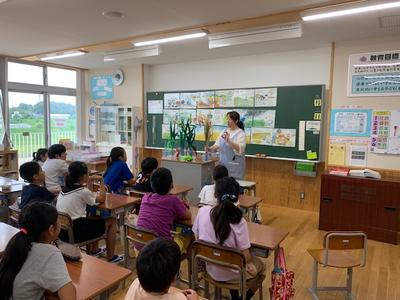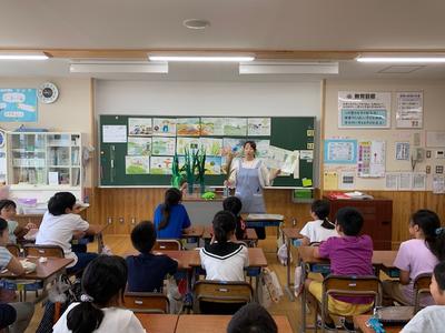 2019年9月3日 12時11分5年生社会科「米づくりのさかんな地域」の学習のまとめとして、米づくりに関連する絵本の読み聞かせが行われました。5年1組から3組まで、3つの学級を学校司書さんが回り、それぞれに米づくりの学習をふり返ることができる話を読み聞かせしました。さらに、手作りの苗の模型も飛び出しました。